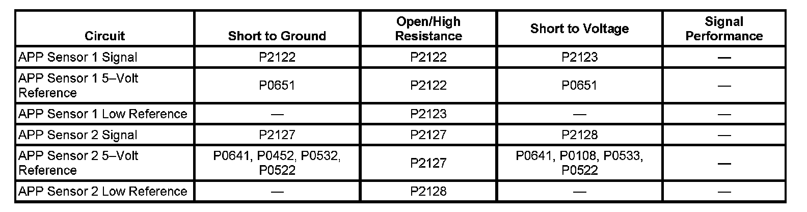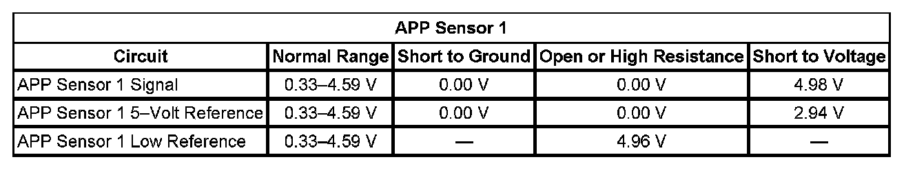 - Accelerator Pedal Position (APP) Sensor 1 Circuit Low Voltage