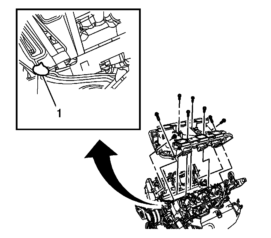 7. With the NEW gaskets and seals in place, apply a small drop, 8-10 mm (0.031-0.39 in) of RTV sealer to the 4 corners of the intake manifold to engine block joints (1). Refer to Adhesives, Fluids, Lubricants, and Sealers (Specifications) .