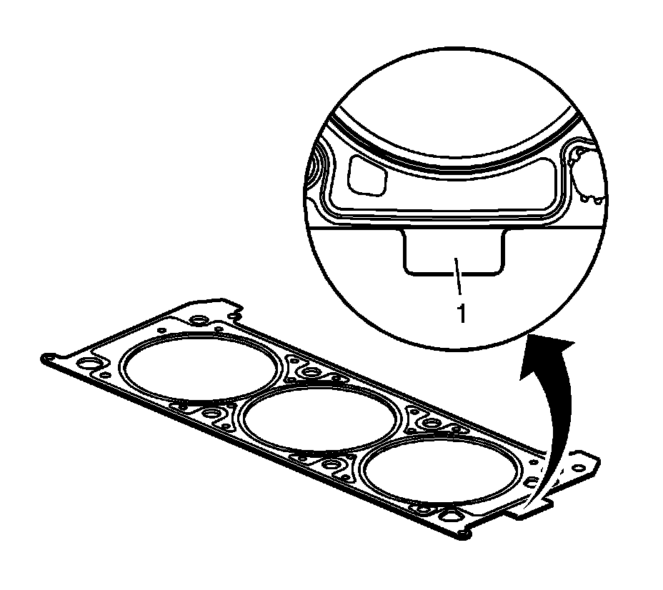 Notice: Head gaskets are specific for right hand and left hand applications, and also must be installed with the correct side facing up. Note the markings (1) on the head gaskets for proper installation. Failure to do so may lead to engine damage.