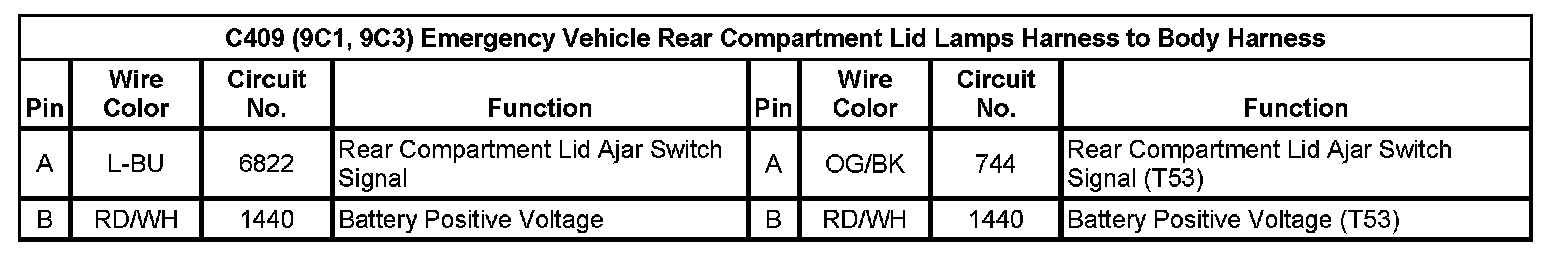 C409 (9C1, 9C3) Emergency Vehicle Rear Compartment Lid Lamps Harness to Body Harness