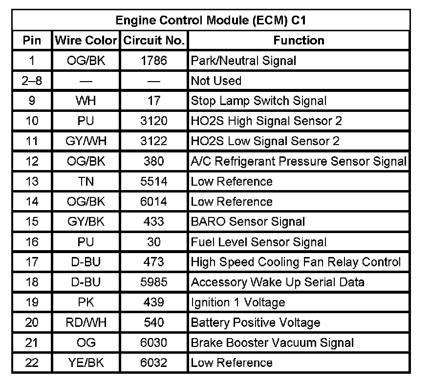 Engine Control Module (ECM) C1 (Pin 1 To 22):