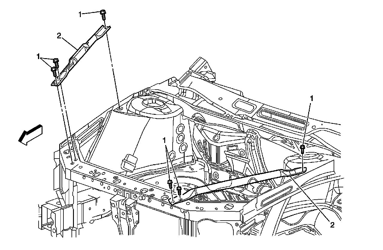 2. Remove the RH front fender upper diagonal brace bolts (1). Release the retainer that secures the wiring harness from the bottom of the brace (2), then remove the upper diagonal brace.