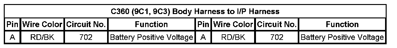 C360 (9C1,9C3) Body Harness To I/P Harness (Pin A):