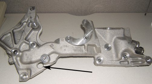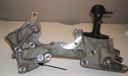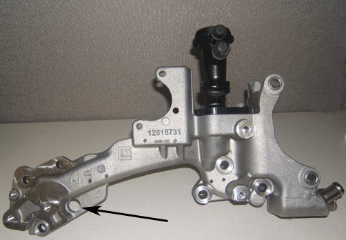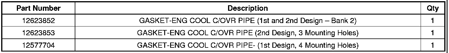 Replace the coolant crossover pipe gaskets with updated service replacement gaskets. There are three coolant crossover designs. The second design crossover started during the 2008 model year. The second design crossover has an access hole for a cylinder head plug on the rear bank (bank 1). This crossover uses the three mounting hole gasket. The two examples below use the three hole gasket.