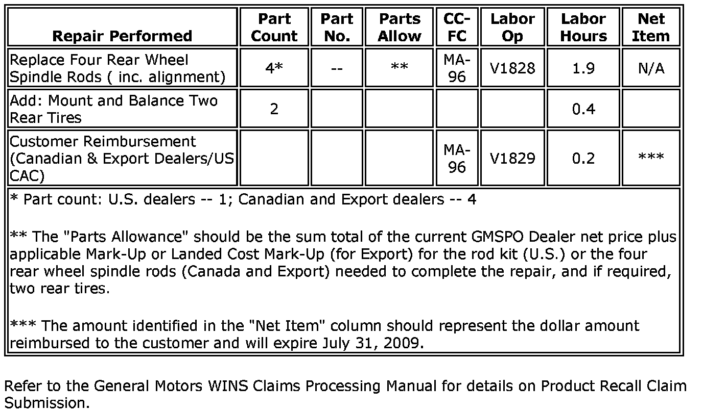 Dealers are to replace the rear wheel spindle rods, align the rear wheels, and if necessary, replace the rear tires (only) that exhibit lower tread depth on the inboard side. If the tires have already been replaced due to this condition, the customer may request reimbursement for the replacement tires until July 31, 2009.