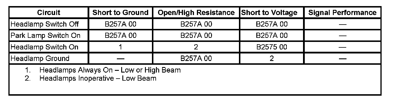 When the headlamp switch is in the OFF position, the body control module (BCM) receives a ground signal through the headlamp switch OFF circuit and an open signal on the park lamp ON circuit. When the headlamp switch is in the PARK or HEAD position, the BCM receives an open signal through the headlamp switch OFF circuit and a ground signal through the park lamp ON circuit.