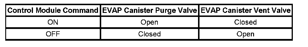 The control module tests the evaporative emission (EVAP) system for a large leak. The control module monitors the fuel tank pressure (FTP) sensor signal to determine the EVAP system vacuum level. When the Conditions for Running are met, the control module commands the EVAP canister purge valve Open and the EVAP vent valve Closed. This allows engine vacuum to enter the EVAP system. At a calibrated time, or vacuum level, the control module commands the EVAP canister purge valve Closed, sealing the system, and monitors the FTP sensor input in order to determine the EVAP system vacuum level. The following table illustrates the relationship between the ON and OFF states, and the Open or Closed states of the EVAP canister purge and vent valves.