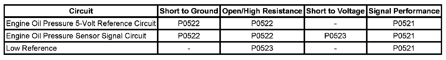 - Engine Oil Pressure (EOP) Sensor Circuit Low Voltage.