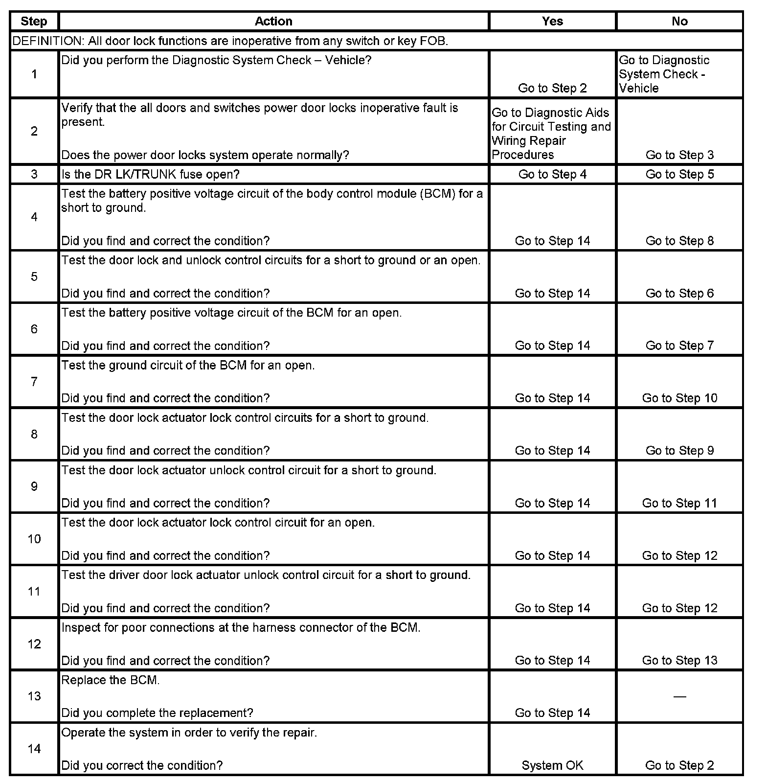 6. This step determines if the malfunction may be caused by an open in the battery positive voltage circuit of the BCM. The BCM provides the voltage needed to power all door lock actuator control circuits. An open in the BCM battery positive voltage circuit of the BCM will cause all door lock functions to be inoperative.