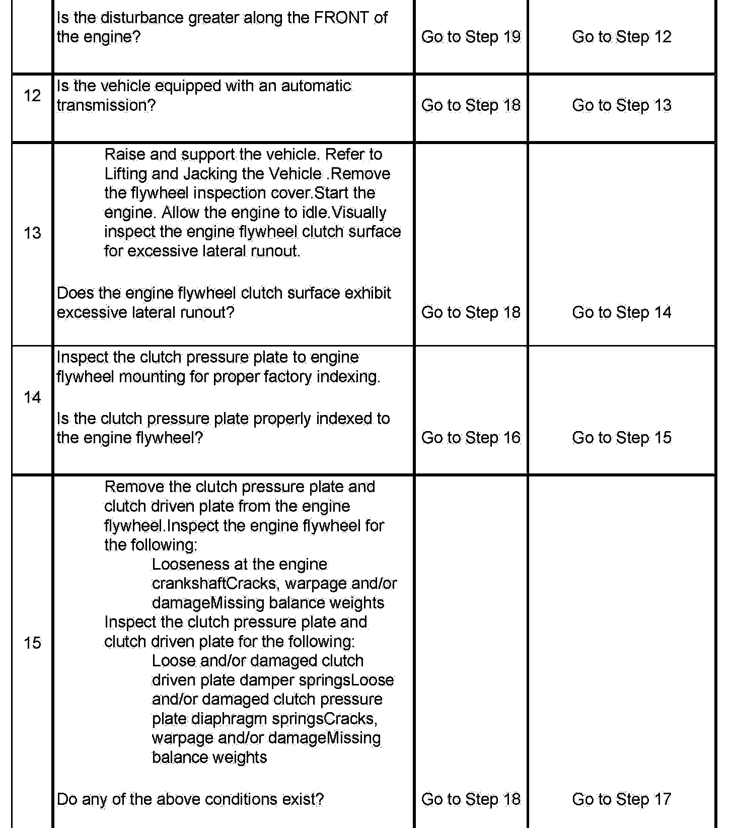 15. An engine flywheel that is loose at the engine crankshaft or that is cracked, damaged and/or missing balance weights; and/or a clutch pressure plate and clutch driven plate that has loose springs, cracks, warpage, damage and/or missing balance weights - can produce a disturbance when their mass is combined.