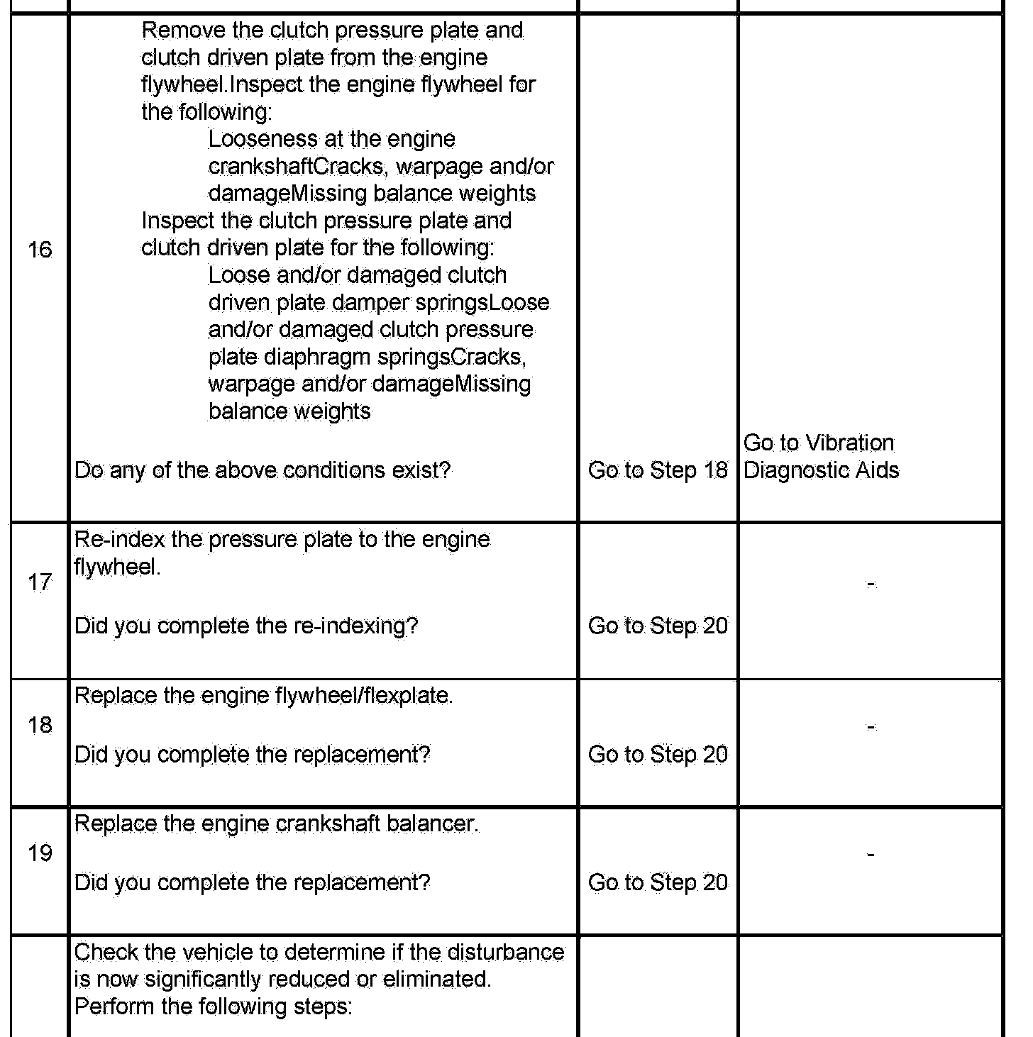 16. An engine flywheel that is loose at the engine crankshaft or that is cracked, damaged and/or missing balance weights; and/or a clutch pressure plate and clutch driven plate that has loose springs, cracks, warpage, damage and/or missing balance weights - can produce a disturbance when their mass is combined.