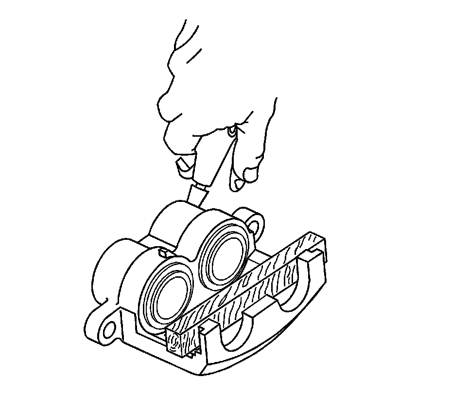 Important: When applying the clean brake fluid to the piston bores and pistons, only apply the brake fluid to one bore at a time. This is done to ensure that the brake caliper, seals and pistons DO NOT become contaminated with dirt or other foreign material.