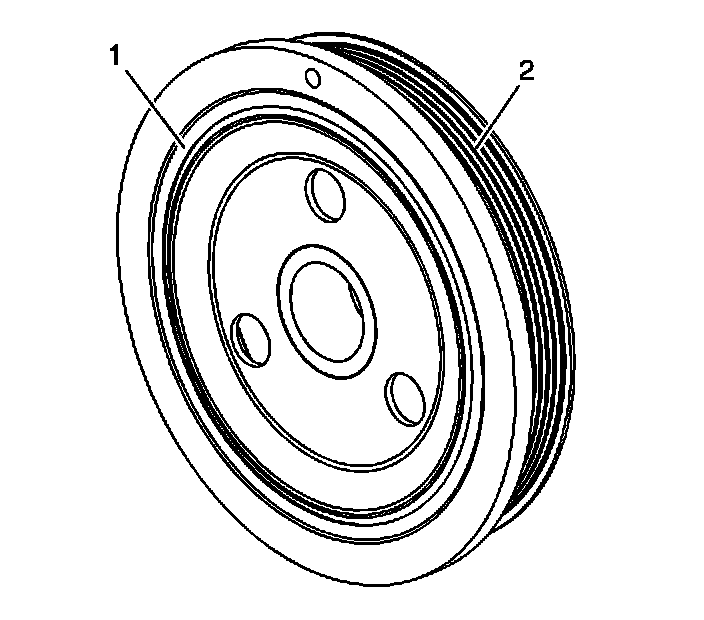 * Worn, chunking, or deteriorated rubber (1) between the hub and pulley