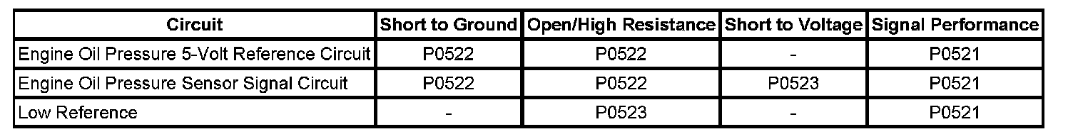 The engine oil pressure (EOP) sensor changes voltage based on the engine oil pressure. The EOP sensor is a 3-wire sensor comprising of the signal circuit, the low reference circuit and the 5-volt reference circuit. The engine control module (ECM) supplies 5-volts to the EOP sensor via the 5-volt reference circuit and provides ground via the EOP low reference circuit. The ECM monitors the signal circuit of the EOP sensor to determine the engine oil pressure sensor voltage is within the normal operating range of approximately 1-4 volts. When the engine oil pressure is high, the EOP sensor voltage is high and the ECM senses a high signal voltage. When the engine oil pressure is low, the EOP sensor voltage is low and the ECM senses a low signal voltage. The ECM sends the EOP information to the instrument panel cluster (IPC) via GMLAN serial data message. The IPC illuminates the engine oil pressure indicator when it receives a GMLAN serial data message indicating a low engine oil pressure condition.