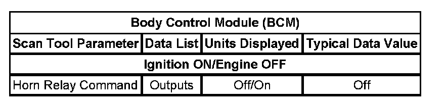 The Horns Scan Tool Data List contains all of the horn related parameters that are available on the scan tool. The parameters in the list are arranged in alphabetical order. The column, Data List, indicates the location of the parameter within the scan tool menu selections. Use the Horns Scan Tool Data List as directed by a diagnostic table or in order to supplement the diagnostic procedures.