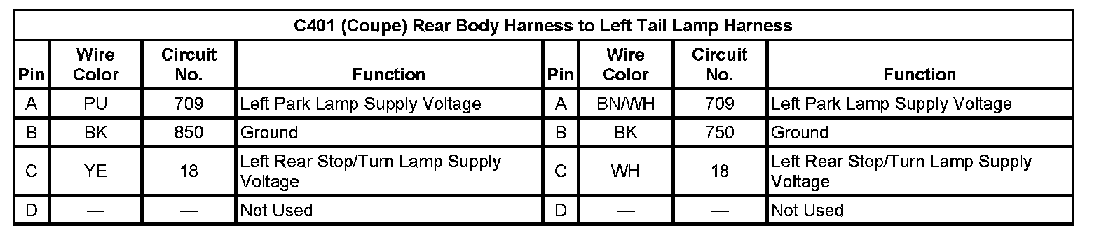 C401 (Sedan) Rear Body Harness To Left Tail Lamp Harness (Pin A To D):
