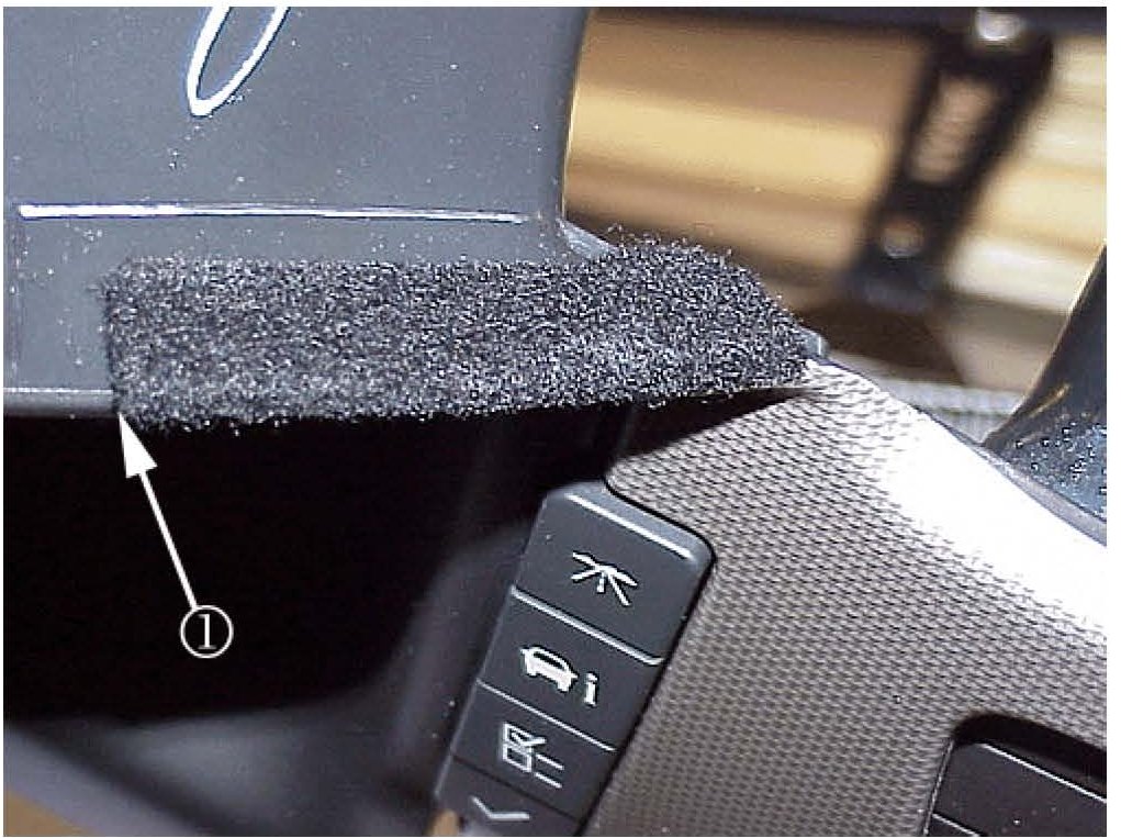 If the vehicle already has the tape installed, it will be necessary to inspect the tape at the rear outer edges. The flocking tape should be wrapped around the rear outer edges (1) of the IP trim panel.