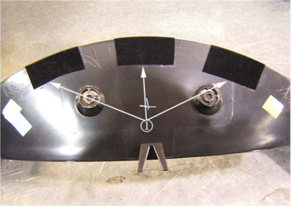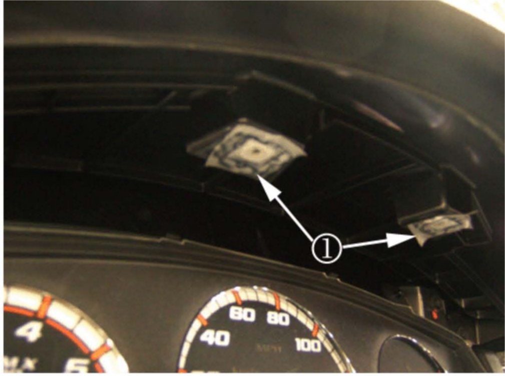 Install the three pieces of flocking tape (1) by wrapping the rear outer edge of the IP trim panel at the three top outlined locations.