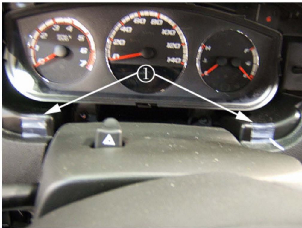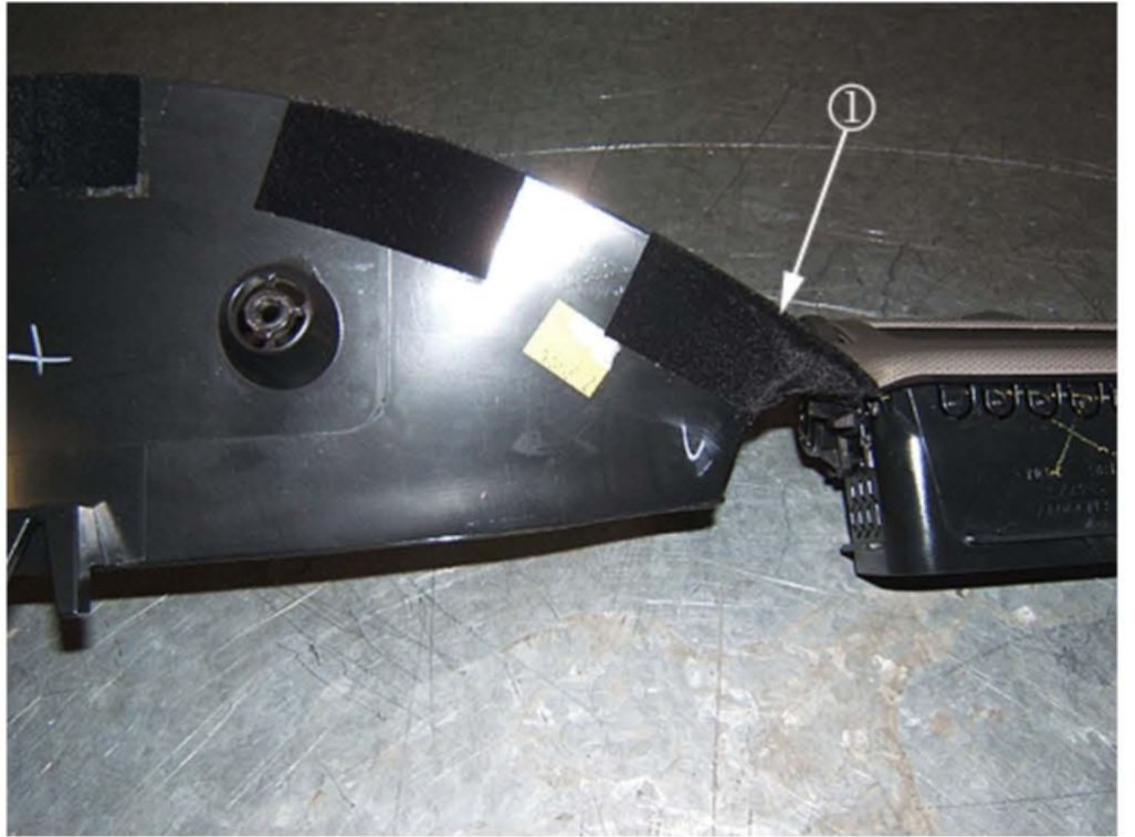 Install a piece of the flocking tape to the top right inside corner of the IP panel by wrapping the rear outer edge of the IP trim and covering the complete inside corner bump (1) in the panel.