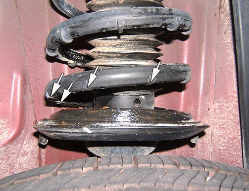 4. Apply lubricant, GM P/N 12345996 (in Canada, use P/N 10953501), or equivalent, to the lower spring coil. Cover the entire area under the removed tabs.