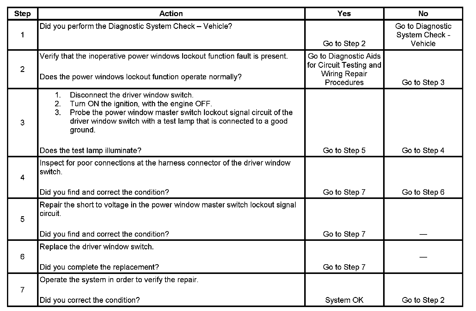3. This step determines if the power window master switch lockout signal circuit may be shorted to battery positive voltage. Normally, with rear window lockout not enabled, this circuit is closed within the master window switch and rear windows are operational from their respective switches. When the lockout feature is enabled, the circuit is open and no voltage is available at the rear window switches. A short to voltage on this circuit would cause power to be supplied to the rear window switches regardless of the lockout switch status.