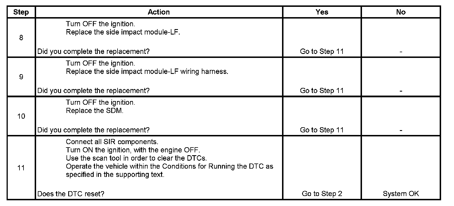 7. Tests to see what DTCs are present. If DTC B0014 01 is present, test the side impact module-LF for a short to battery voltage on the high and low circuits. If DTC B0014 02 is present, test the side impact module-LF for a short to ground on the high and low circuits. If DTC B0014 04, 0D, 0E is present, test the side impact module-LF test the high and low circuits for an open circuit and for high or low resistance.