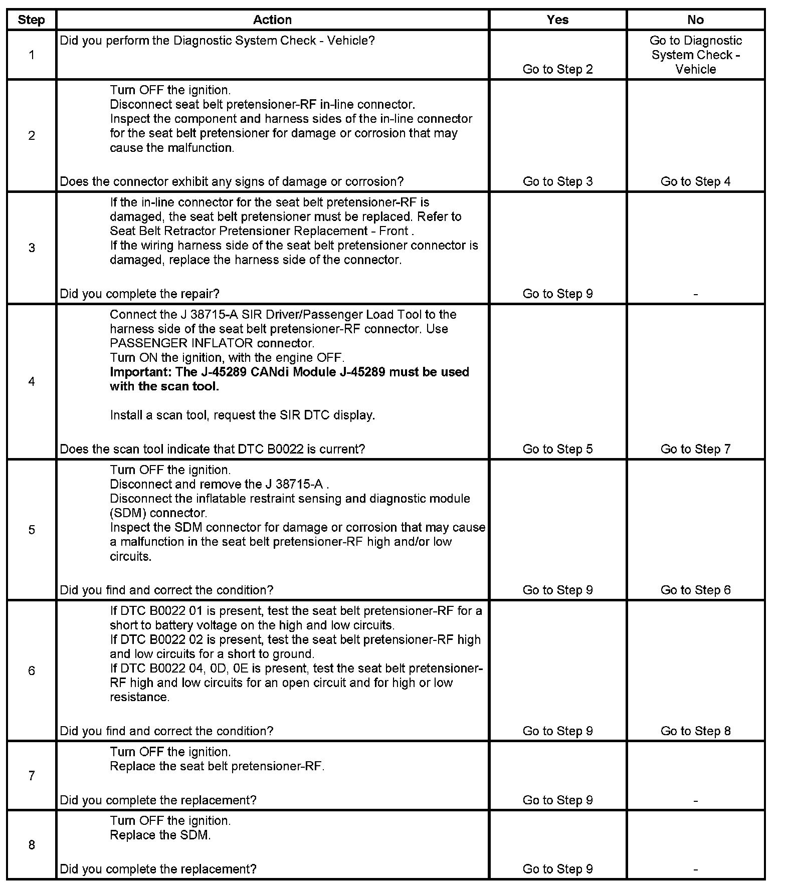 6. This step tests to see what DTCs are present. If DTC B0022 01 is present, test the seat belt pretensioner-RF for a short to battery voltage on the high and low circuits. If DTC B0022 02 is present, test the seat belt pretensioner-RF high and low circuits for a short to ground. If DTC B0022 04, 0D, 0E is present, test the seat belt pretensioner-RF high and low circuits for an open circuit and for high or low resistance.