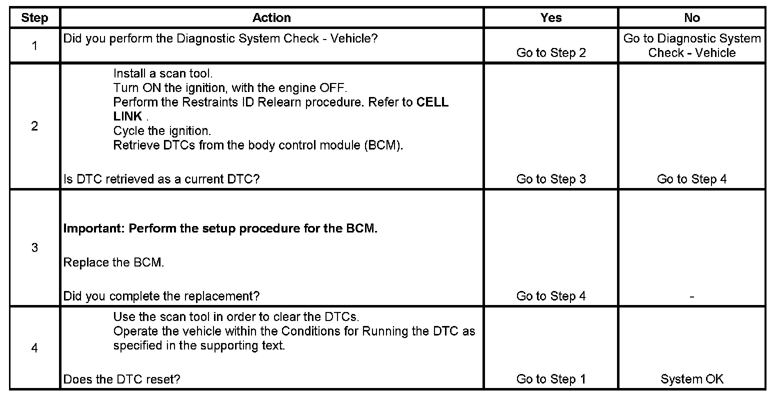 The body control module (BCM) stores the last 4 digits of the sensing and diagnostic module (SDM) part number, information also called restraints ID. After the BCM is reprogrammed, the restraints ID is set to zero. A restraints ID relearn needs to be performed for the BCM. For more information on this procedure, refer to CELL LINK.