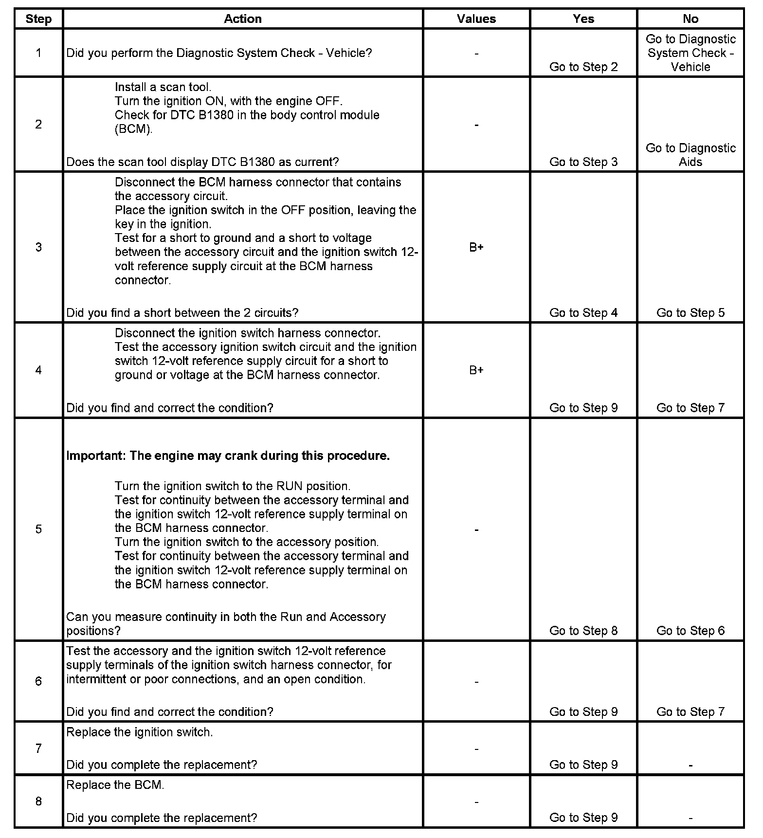 The body control module (BCM) monitors the ACCESSORY signal from the ignition switch. When the vehicle operator places the ignition switch in the Accessory or Run position, the switch supplies B+ to the BCM ACCESSORY input terminal. If this circuit becomes shorted to B+, ground or the circuit opens, DTC B1380 will set.