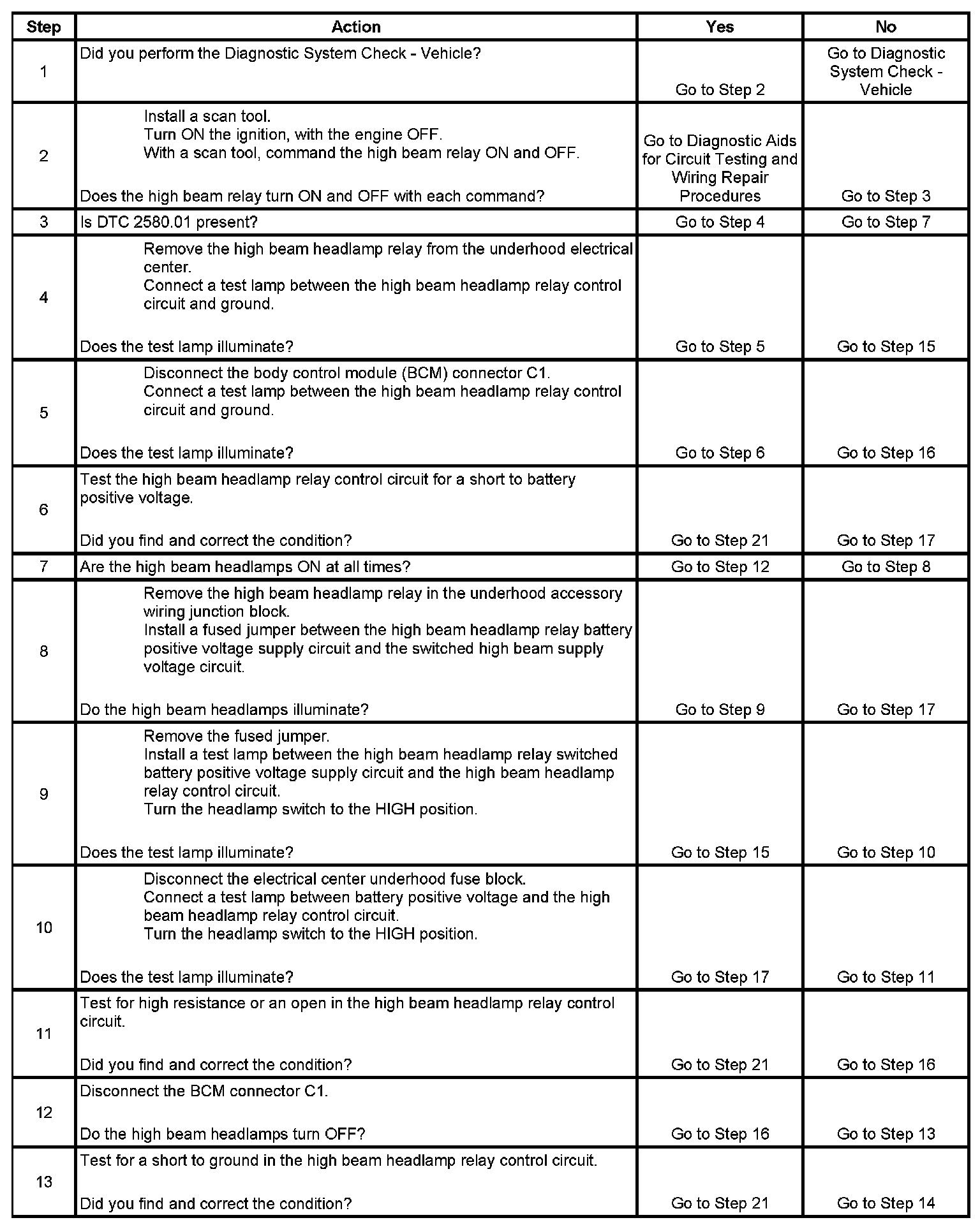 The high beam relay is controlled by the body control module (BCM). The BCM provides ground to the high beam relay control circuit in order to turn ON the high beam relay. When the high beam relay control circuit opens, becomes shorted to voltage, or becomes shorted to ground without being commanded ON by the BCM, DTC B2580 is set.