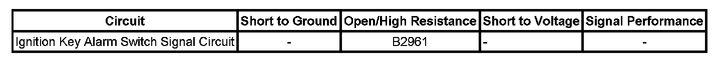 The body control module (BCM) monitors the ignition key alarm switch. When the key is in the ignition, the ignition key alarm switch is closed and the signal circuit is low. When the key is not in the ignition, the ignition key alarm switch is open and the signal circuit is high.
