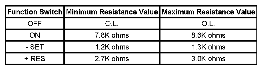 Important: The cruise control ON/OFF switch must be ON in order to properly measure the resistance of the ON, - Set/Cruise, and the + Resume/Accelerate switches.