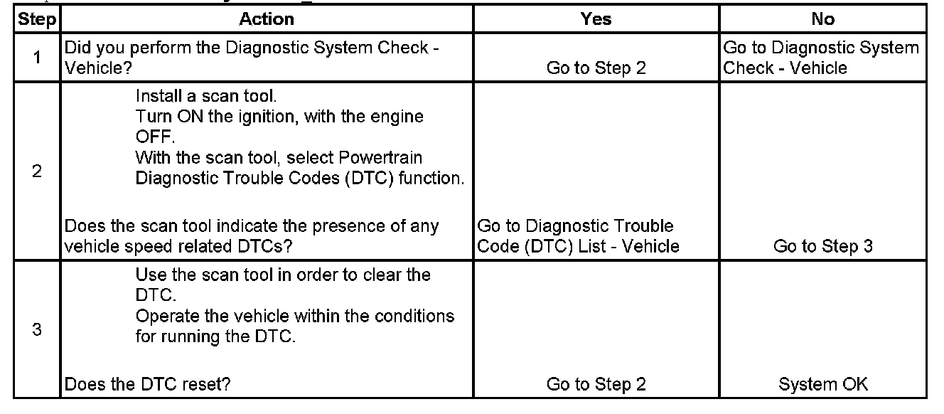 2. This step tests for the presence of vehicle speed related DTCs in the control module where the vehicle speed message originates.