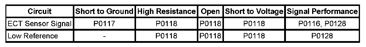 * A slight to moderate resistance in the ECT sensor signal circuit or low reference circuit will affect this diagnostic. This condition results in a greater voltage on the ECT sensor signal circuit, which is interpreted by the ECM as a colder ECT.