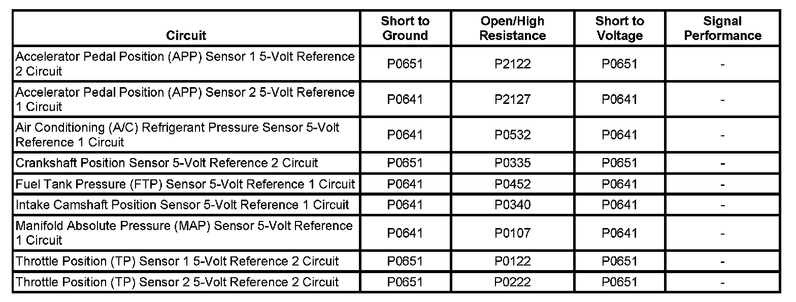 The engine control module (ECM) has 2 internal 5-volt reference busses called 5-volt reference 1 and 5-volt reference 2. Each reference bus provides 5-volt reference circuits for more than one sensor. Therefore, a fault condition on one 5-volt reference circuit will affect the other 5-volt reference circuits connected to that reference bus. The ECM monitors the voltage on the 5-volt reference busses.