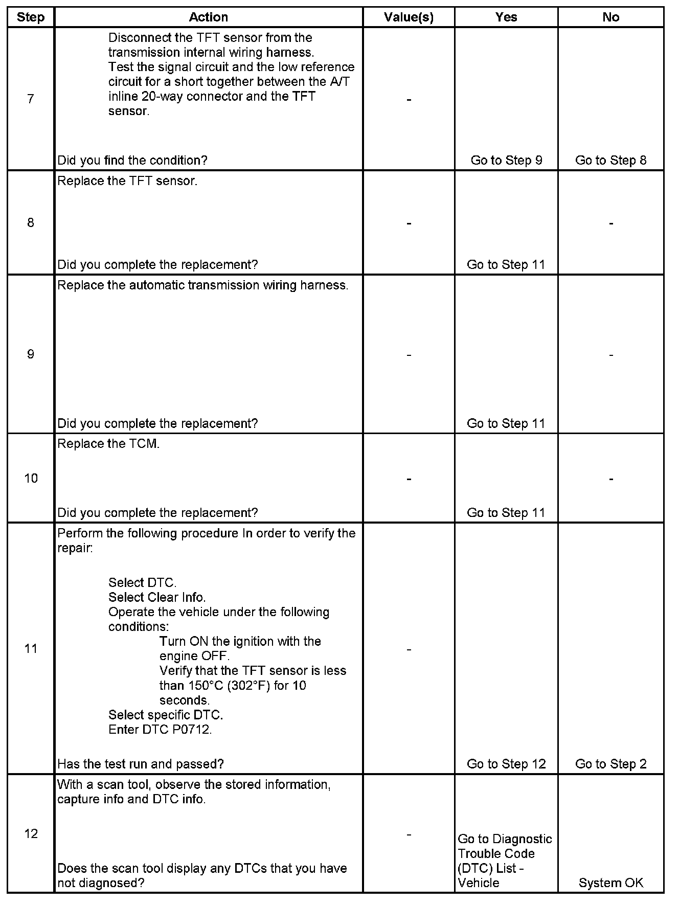 If the TCM detects a continuous short to ground in the TFT sensor signal circuit, then DTC P0712 sets. DTC P0712 is a type C DTC.
