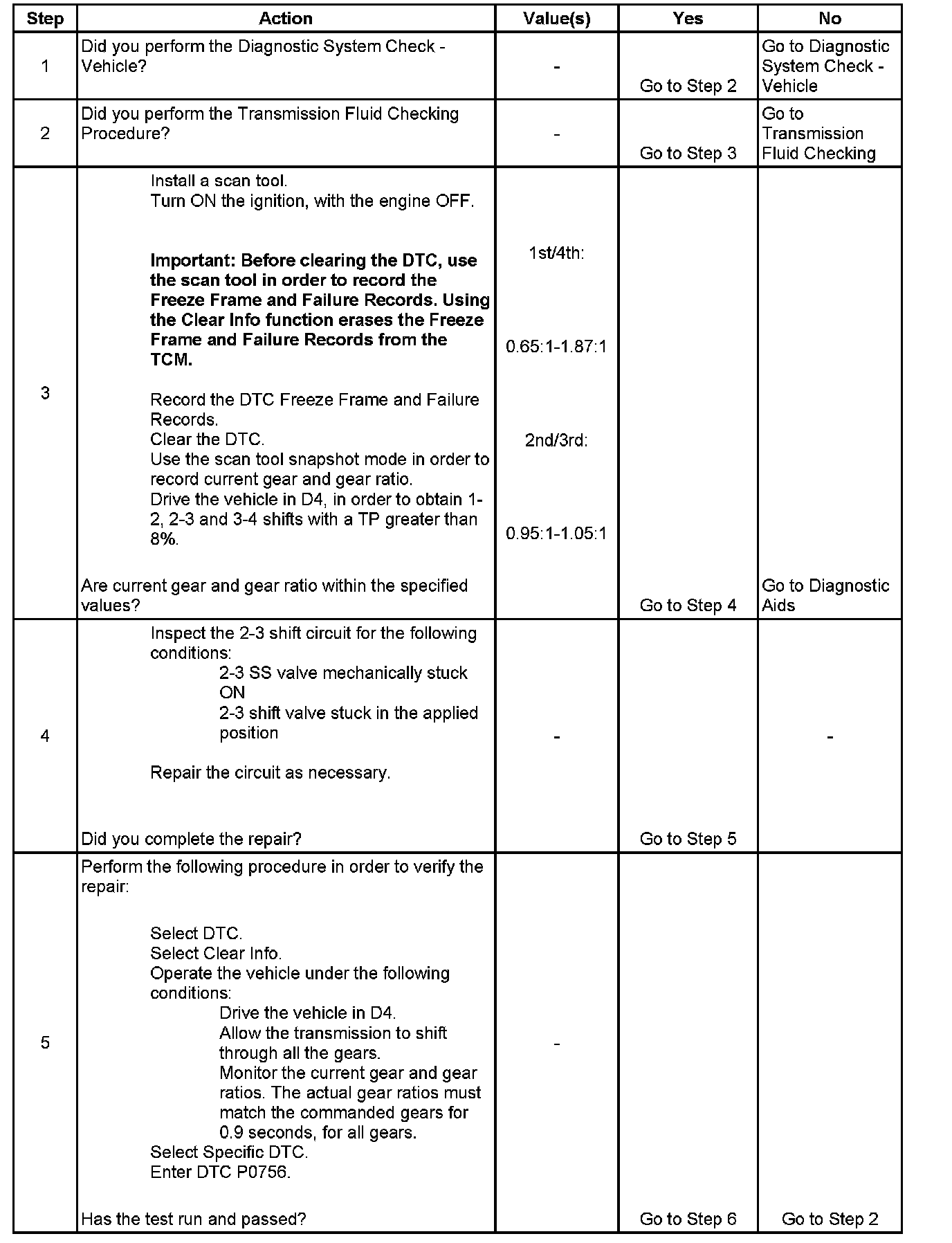 The transmission control module (TCM) monitors the actual gear ratio, and compares the actual gear ratio with the commanded gear ratio. DTC P0756 sets under two conditions: