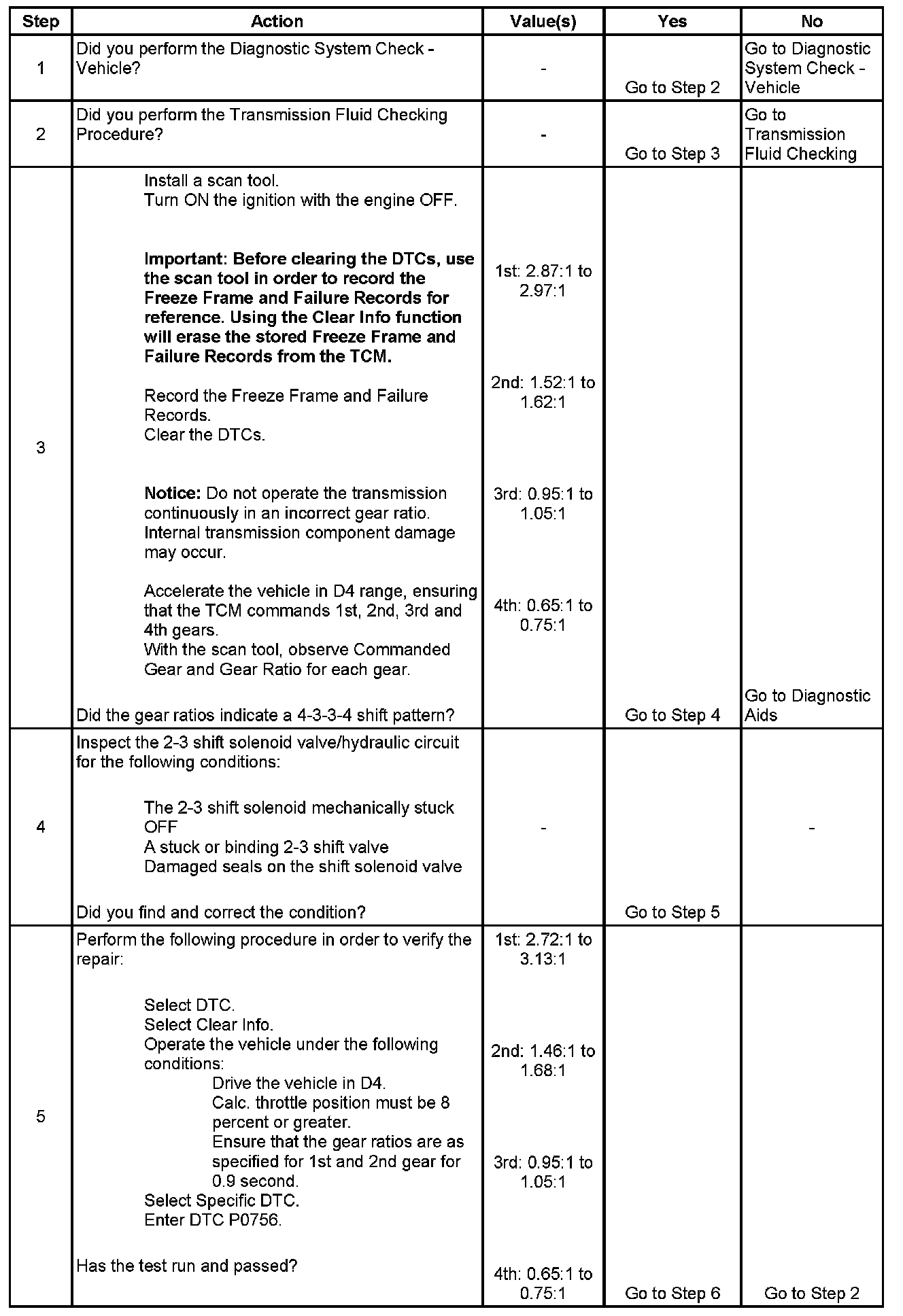 If the TCM detects a 4th gear ratio when 1st gear is commanded and a 3rd gear ratio when 2nd gear is commanded, then DTC P0756 sets. DTC P0756 is a type A DTC.