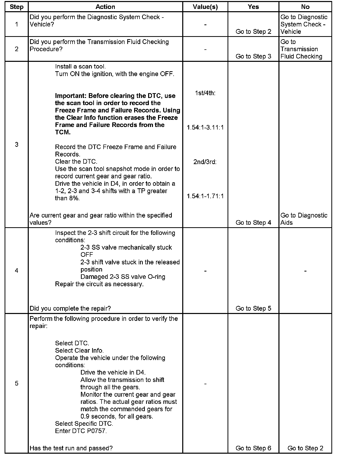 The transmission control module (TCM) monitors the actual gear ratio, and compares the actual gear ratio with the commanded gear ratio. DTC P0757 sets under two conditions: