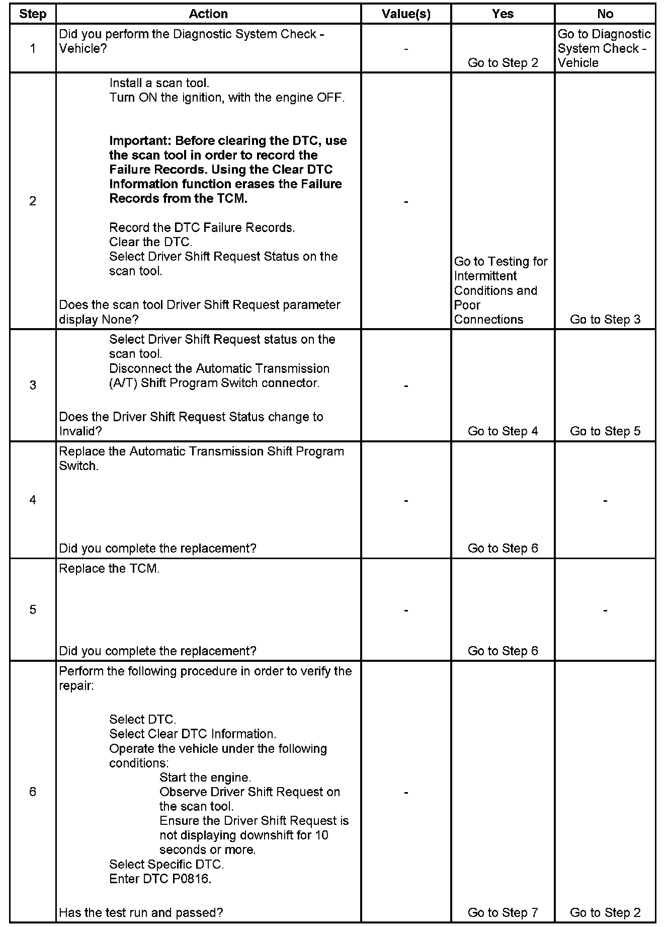 If the transmission control module (TCM) detects the downshift circuit active for an extended period of time, then DTC P0816 sets. DTC P0816 is a type C DTC.