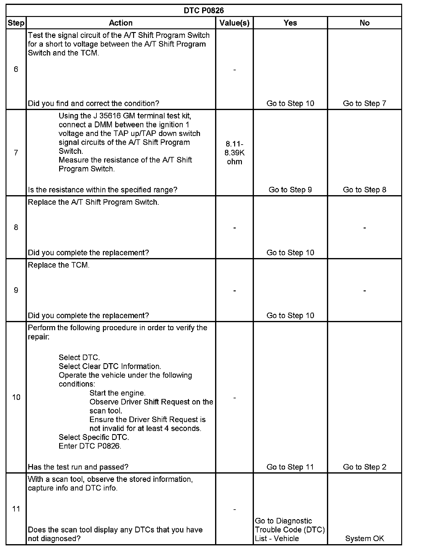 If the transmission control module (TCM) detects an invalid voltage on the TAP up/TAP down switch signal circuit, then DTC P0826 sets. DTC P0826 is a type C DTC.