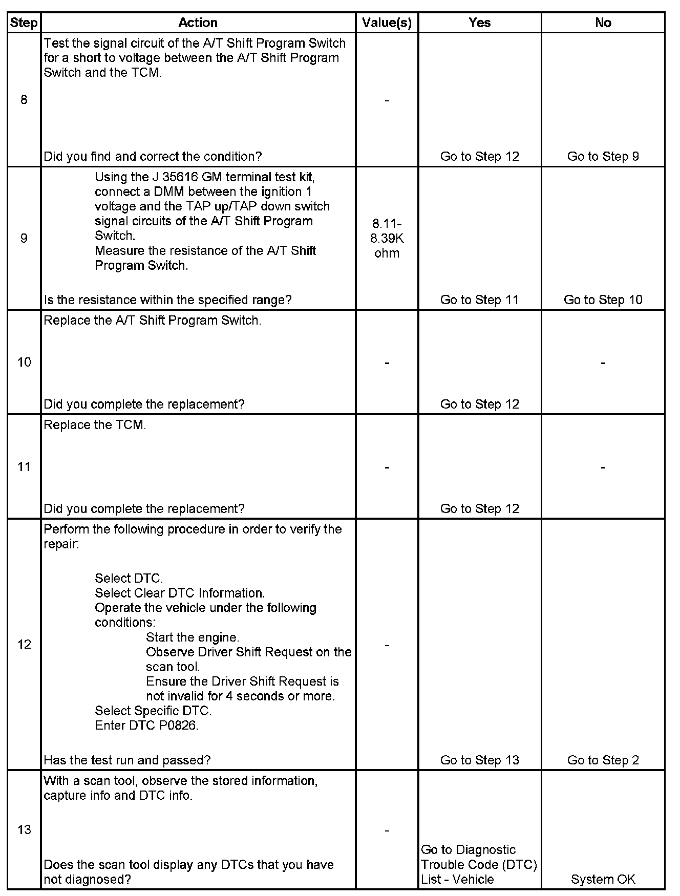 If the transmission control module (TCM) detects an invalid voltage on the TAP up/TAP down switch signal circuit, then DTC P0826 sets. DTC P0826 is a type C DTC.