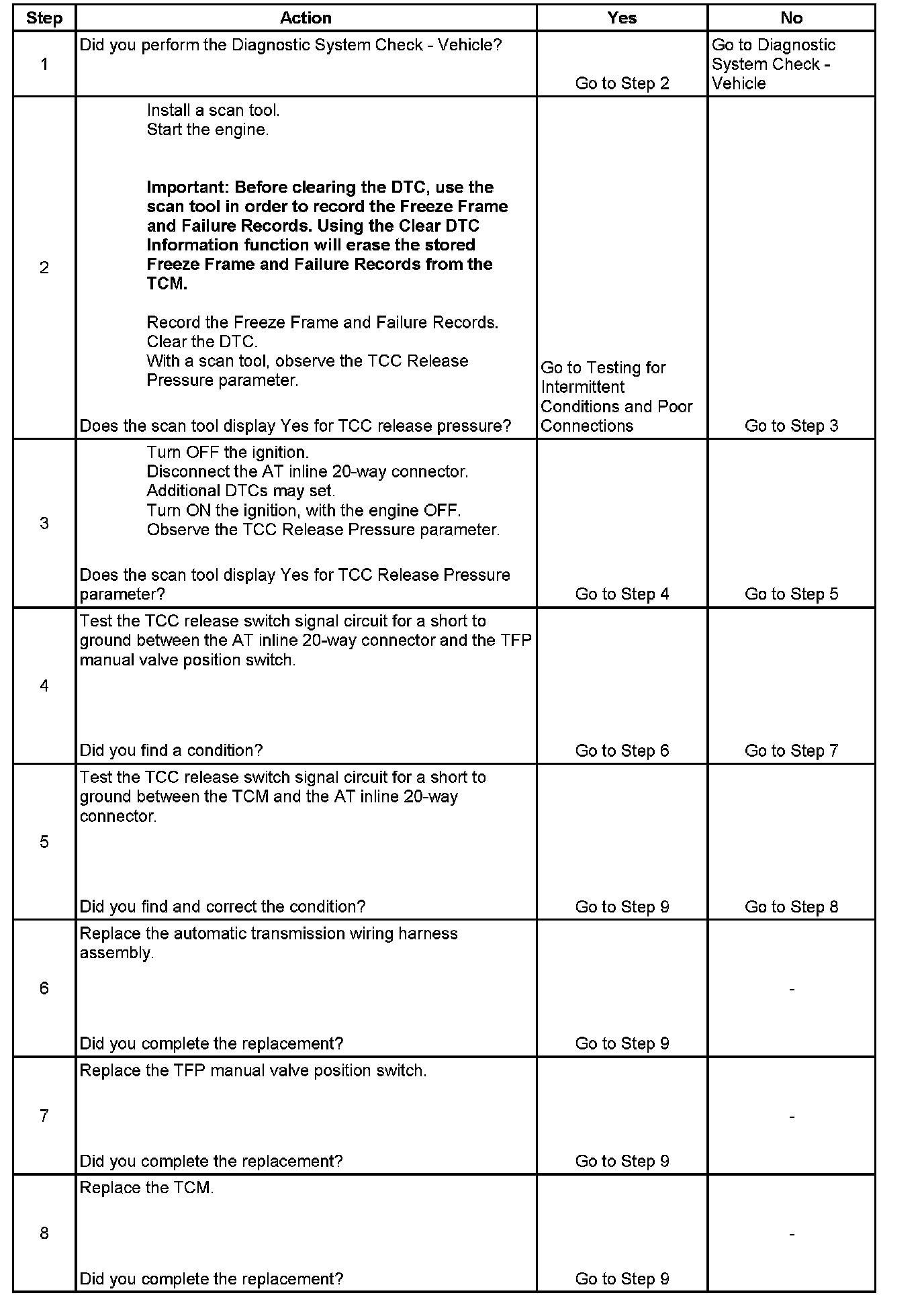* The TCM records the operating conditions when the Conditions for Setting the DTC are met. The TCM stores this information as Freeze Frame and Failure Records.