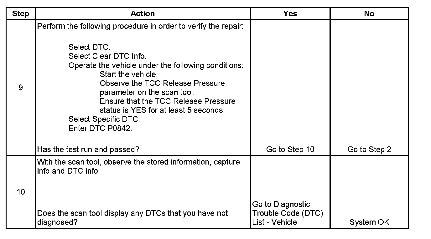When the TCM determines that the TCC release switch is closed, indicating that the TCC is applied, and the TCC slip speed indicates that the TCC is not applied, then DTC P0842 sets. DTC P0842 is a type B DTC.