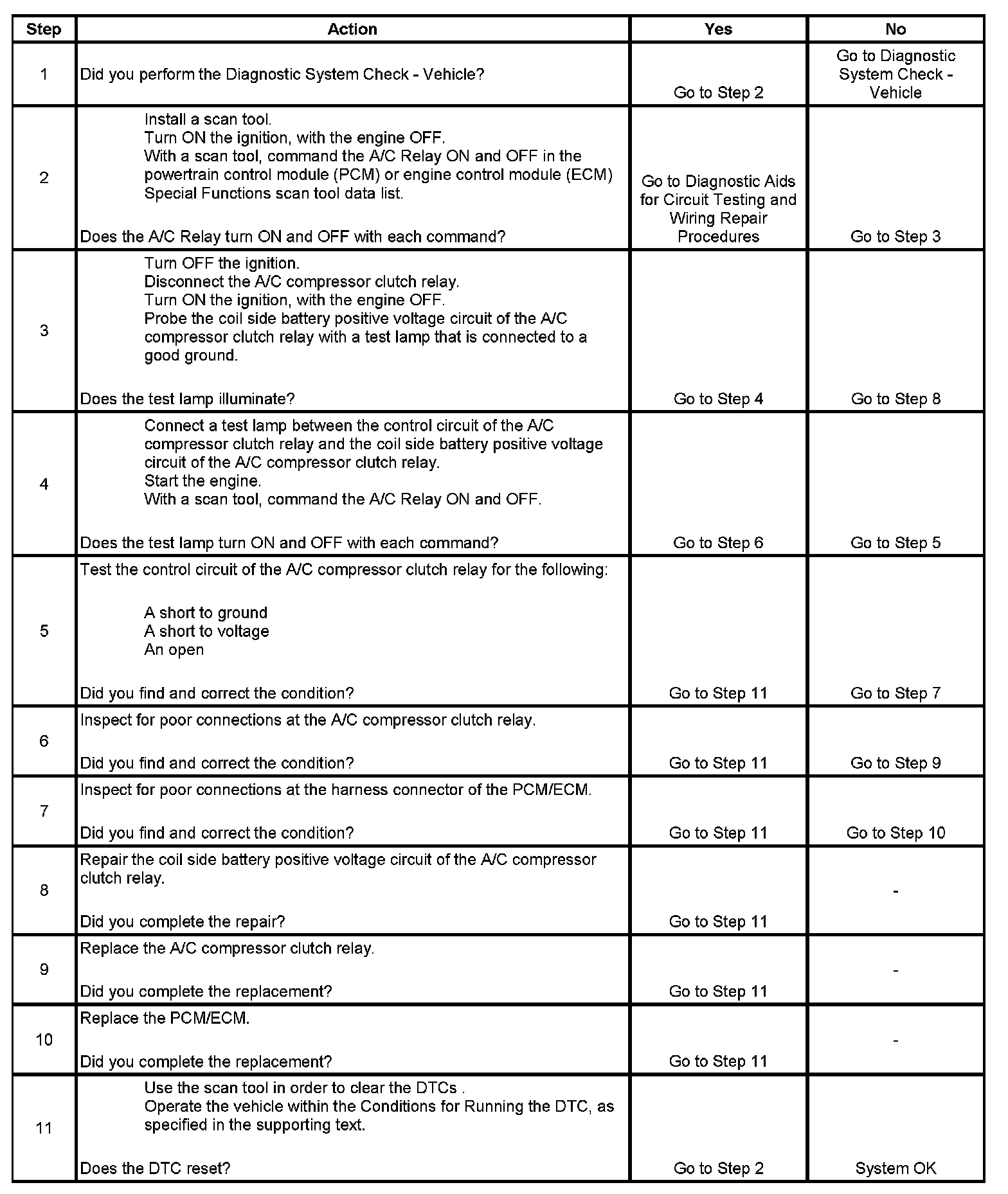 Ignition voltage is supplied directly to the A/C compressor clutch relay. The powertrain control module (PCM) or engine control module (ECM) controls the relay by grounding the A/C clutch relay control circuit via an internal solid state device called a driver. The primary function of the driver is to supply the ground for the component being controlled. The driver has a fault line which is monitored by the PCM/ECM. When the PCM/ECM is commanding a component ON, the voltage of the control circuit should be near 0 volts. When the PCM/ECM is commanding the control circuit to a component OFF, the voltage potential of the circuit should be near battery voltage. If the fault detection circuit senses a voltage other than what is expected, this DTC will set.