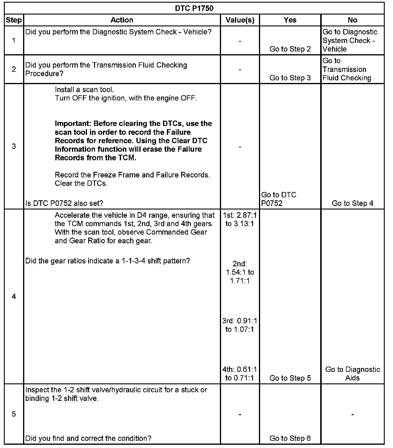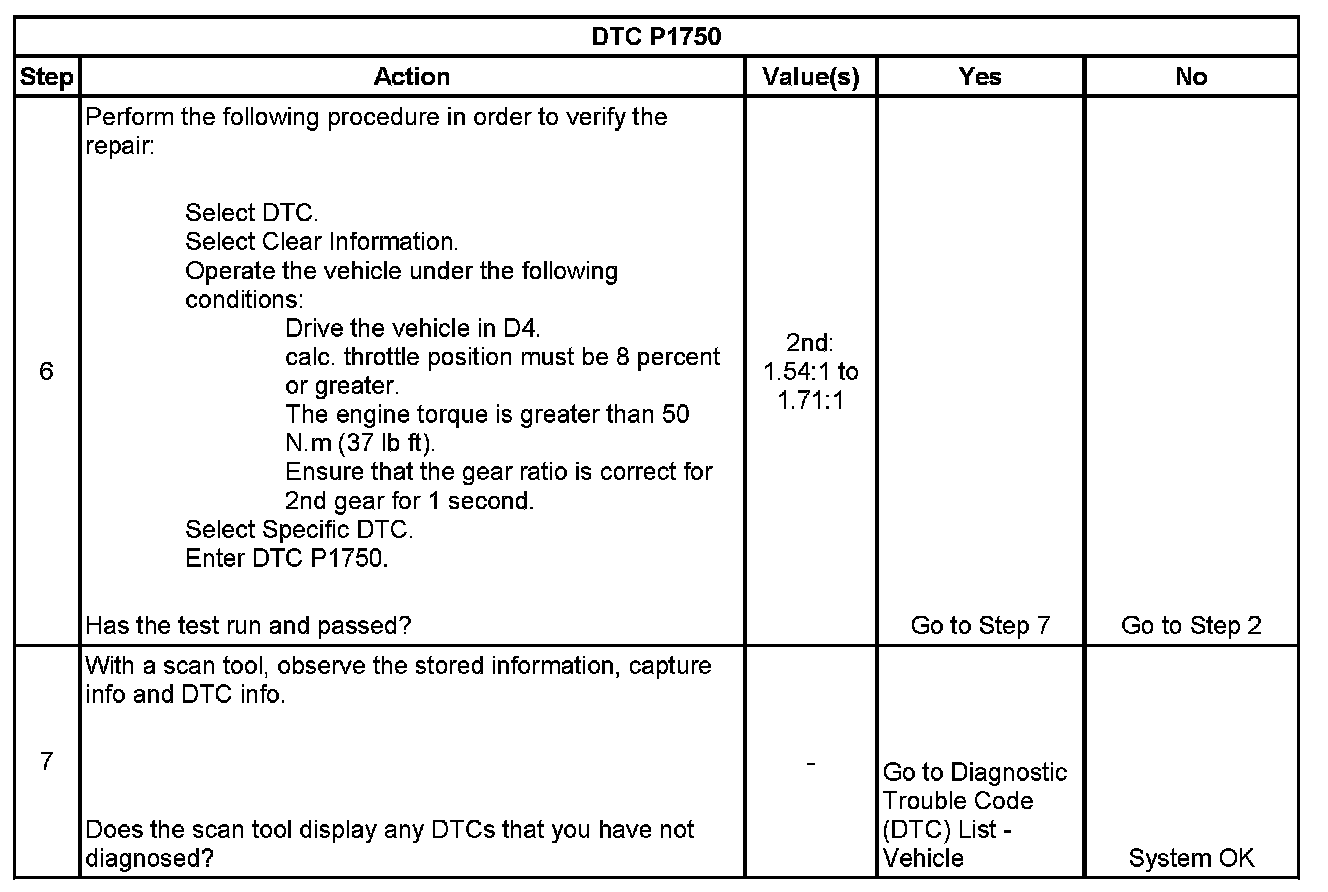 If the transmission control module (TCM) detects a 1st gear ratio when 2nd gear is commanded indicating a stuck 1-2 shift valve, then DTC P1750 sets. DTC P1750 is a type C DTC.