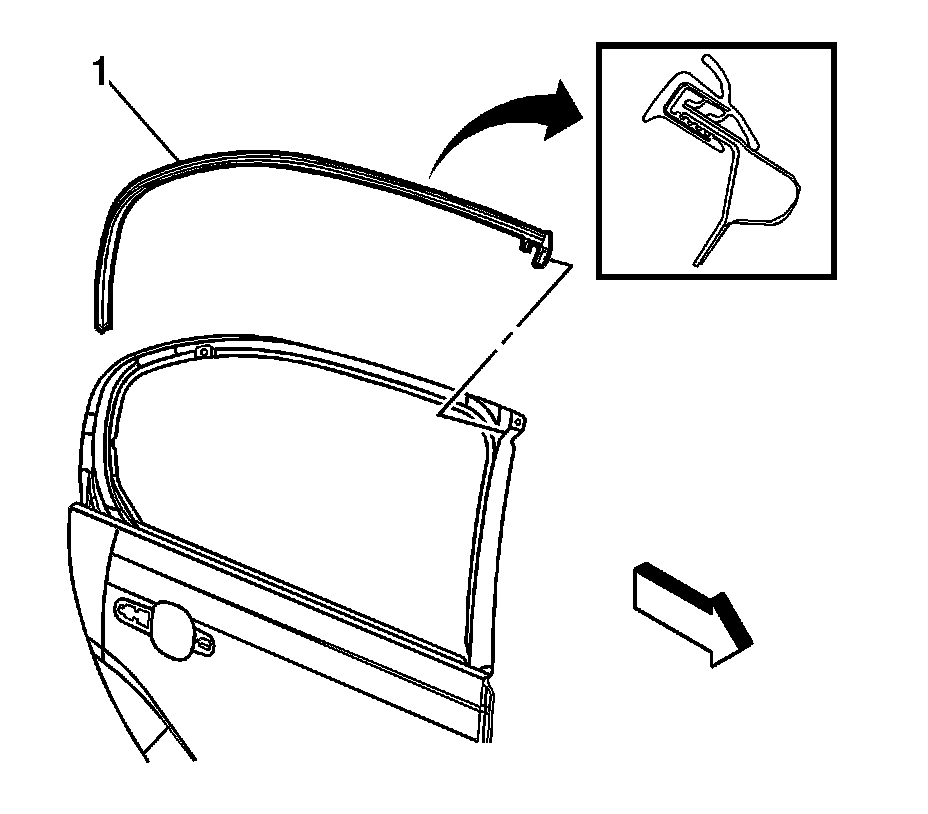 3. Insert the retainer pin into the inner panel. Push the weatherstrip (1) to secure the remaining material onto the pinch-weld flange. Work from both ends toward the middle of the window frame header.