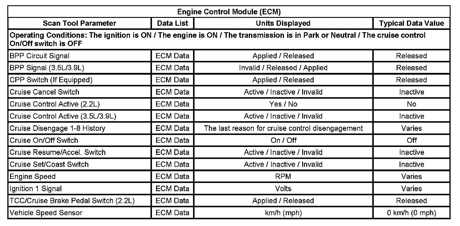 The scan tool data lists contain all of the cruise control related parameters that are available on the scan tool. The parameters in the list are arranged in alphabetical order. The data list column indicates the location of the parameter within the scan tool menu selections.