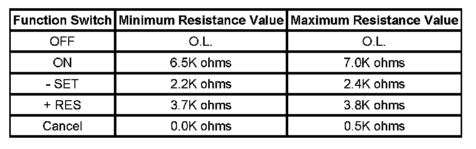 Important: The cruise control ON/OFF switch must be ON in order to properly measure the resistance of the - SET, the + RES, and the Cancel switches.