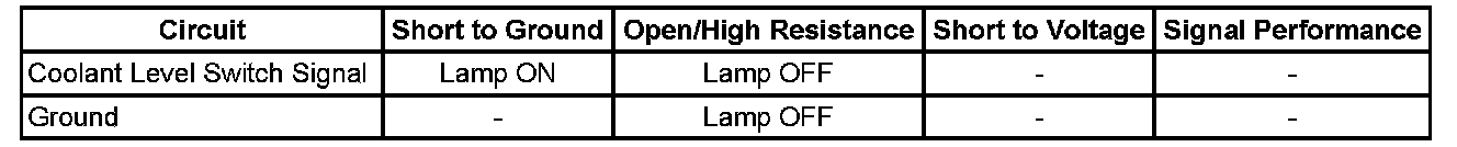 - If the low coolant level indicator does not turn OFF with the switch disconnected, test the signal circuit of the coolant level switch for a short to ground.